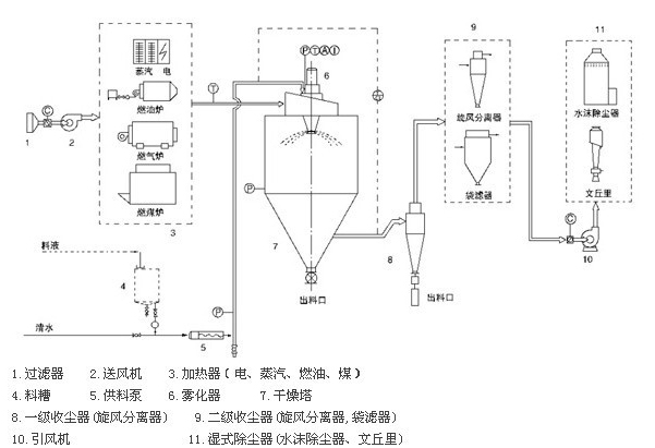 空氣通過過濾器和加熱器,進(jìn)入干燥器頂部的空氣分配器,熱空氣呈螺旋狀均勻進(jìn)入干燥器。料液由料液槽經(jīng)過濾器由泵送至干燥器的離心霧化器,使料液噴成績效的霧狀液滴,料液和熱空氣并流接觸水分迅速蒸發(fā),在短時間內(nèi)干燥為粉末狀成品。成品由于干燥塔地步和旋風(fēng)分離器排除,廢棄由風(fēng)機(jī)排出。